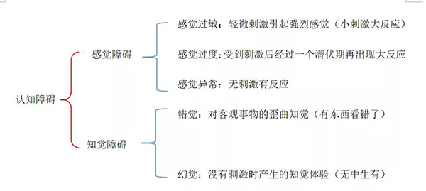 感觉障碍,指在反映刺激物个别属性的过程中出现困难和异常;认知障碍,指与学习记忆以及思维判断有关的大脑高级智能加工过程出现异常,从而引起严重学习、记忆障碍,同时伴有失语或失用或失认或失行等改变的病理过程。