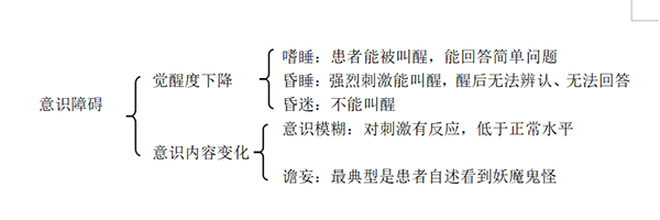 意识障碍可为觉醒度下降和意识内容变化两方面。前者表现为嗜睡、昏睡和昏迷;后者表现为意识模糊和谵妄等。分别如下: