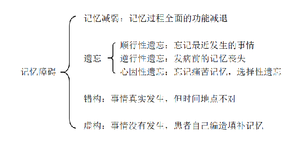 记忆障碍有记忆减弱、遗忘、错构、虚构等。其中记忆减弱、遗忘等在正常人中也有,不是精神病学的重点,错构、虚构是记忆障碍的重点。