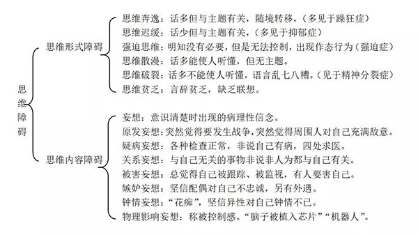 思维障碍分思维形式障碍、思维内容障碍,具体包含如下: